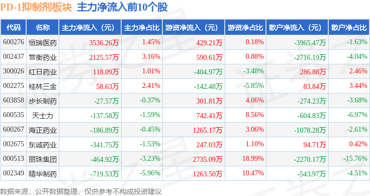 从资金流向上来看,当日PD-1抑制剂板块主力资金净流出7.21亿元,游资资金净流入3.02亿元,散户资金净流入4.19亿元。PD-1抑制剂板块个股资金流向见下表: