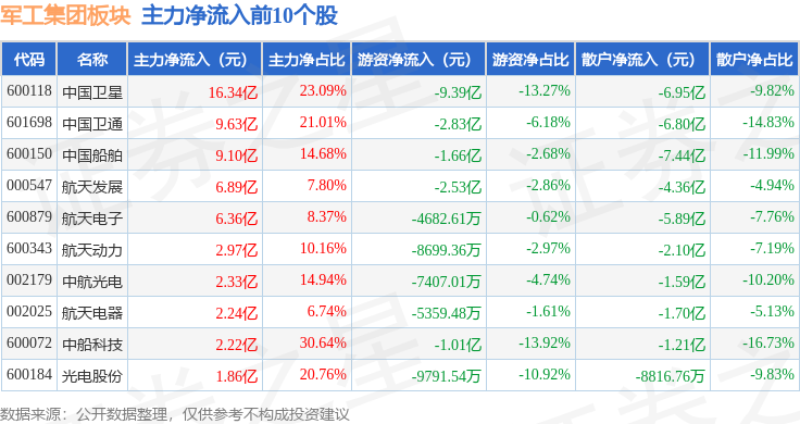 从资金流向上来看,当日军工集团板块主力资金净流入66.08亿元,游资资金净流出24.94亿元,散户资金净流出41.15亿元。军工集团板块个股资金流向见下表: