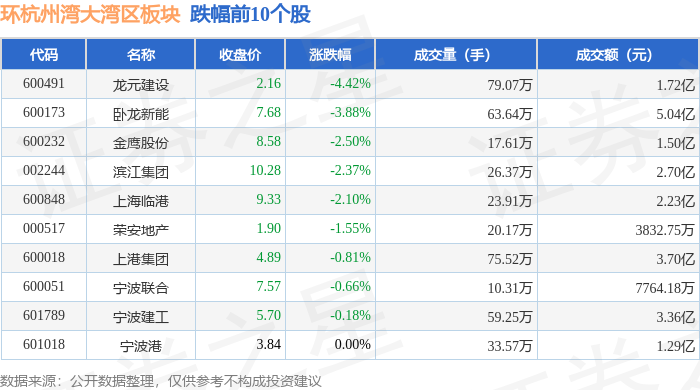 证券之星消息,4月20日环杭州湾大湾区板块较上一交易日下跌0.01%,龙元建设领跌。当日上证指数报收于4082.13,上涨0.76%。深证成指报收于14966.75,上涨0.55%。环杭州湾大湾区板块个股涨跌见下表: