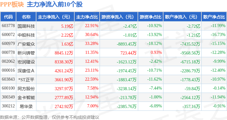 从资金流向上来看,当日PPP板块主力资金净流出8.09亿元,游资资金净流入1.5亿元,散户资金净流入6.59亿元。PPP板块个股资金流向见下表: