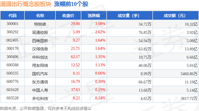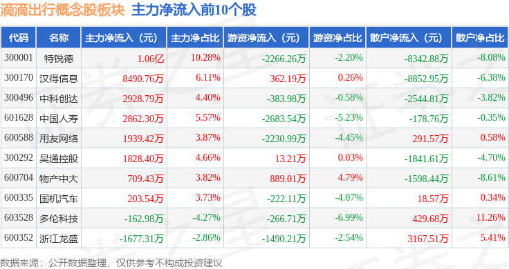 从资金流向上来看,当日滴滴出行概念股板块主力资金净流入8058.44万元,游资资金净流出4636.71万元,散户资金净流出3421.73万元。滴滴出行概念股板块个股资金流向见下表: