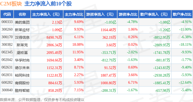 从资金流向上来看,当日C2M板块主力资金净流入3.83亿元,游资资金净流出1.08亿元,散户资金净流出2.74亿元。C2M板块个股资金流向见下表: