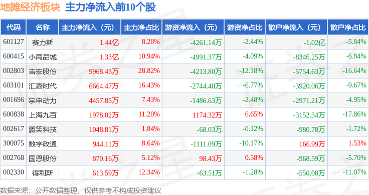 从资金流向上来看,当日地摊经济板块主力资金净流入1.17亿元,游资资金净流出2.13亿元,散户资金净流入9521.47万元。地摊经济板块个股资金流向见下表: