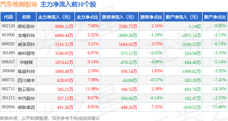 从资金流向上来看,当日汽车检测板块主力资金净流出1.32亿元,游资资金净流入7518.99万元,散户资金净流入5684.1万元。汽车检测板块个股资金流向见下表: