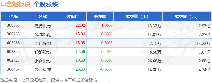 证券之星消息,4月20日口含烟板块较上一交易日下跌0.03%,赢合科技领跌。当日上证指数报收于4082.13,上涨0.76%。深证成指报收于14966.75,上涨0.55%。口含烟板块个股涨跌见下表: