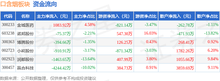 从资金流向上来看,当日口含烟板块主力资金净流出6005.09万元,游资资金净流出226.22万元,散户资金净流入6231.3万元。口含烟板块个股资金流向见下表: