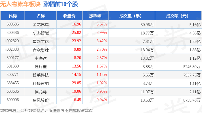 证券之星消息,4月20日无人物流车板块较上一交易日上涨0.57%,金龙汽车领涨。当日上证指数报收于4082.13,上涨0.76%。深证成指报收于14966.75,上涨0.55%。无人物流车板块个股涨跌见下表: