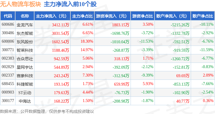 从资金流向上来看,当日无人物流车板块主力资金净流出1.76亿元,游资资金净流入5139.9万元,散户资金净流入1.24亿元。无人物流车板块个股资金流向见下表: