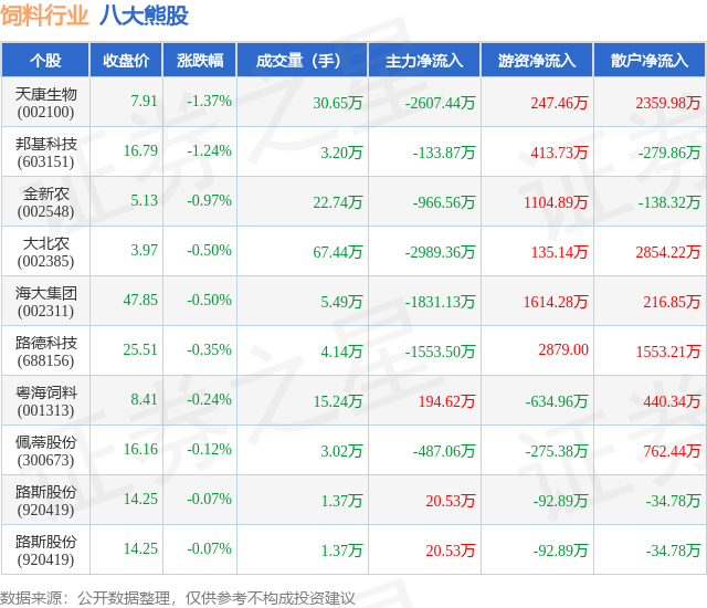 个股表现方面,饲料行业当日领跌股为天康生物(002100),该股当日报收7.91,下跌1.37%,成交量30.65万,主力资金净流出2607.44万元。邦基科技(603151)以下跌1.24%紧随其后,该股当日成交量3.2万,主力资金净流出133.87万元。除此之外,金新农(002548)、大北农(002385)、海大集团(002311)均进入当日熊股之列。具体个股列表见下表: