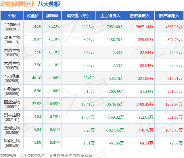 个股表现方面,动物保健行业当日领跌股为生物股份(600201),该股当日报收14.5,下跌1.23%,成交量20.25万,主力资金净流出7052.4万元。瑞普生物(300119)以下跌1.18%紧随其后,该股当日成交量3.75万,主力资金净流出1186.76万元。除此之外,大禹生物(920970)、大禹生物(920970)、*ST绿康(002868)均进入当日熊股之列。具体个股列表见下表: