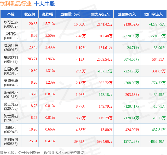 个股表现方面,饮料乳品行业当日领涨股为妙可蓝多(600882),该股当日报收20.35,上涨5.71%,成交量16.5万,主力资金净流入2141.42万元。泉阳泉(600189)以上涨5.5%紧随其后,该股当日成交量17.48万,主力资金净流入912.48万元。除此之外,海融科技(300915)、东鹏饮料(605499)、庄园牧场(002910)均进入当日牛股之列。具体个股列表见下表: