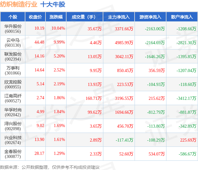 个股表现方面,纺织制造行业当日领涨股为华升股份(600156),该股当日报收10.19,上涨10.04%,成交量35.67万,主力资金净流入3371.66万元。云中马(603130)以上涨9.99%紧随其后,该股当日成交量4.46万,主力资金净流入4985.99万元。除此之外,联发股份(002394)、万事利(301066)、欣龙控股(000955)均进入当日牛股之列。具体个股列表见下表: