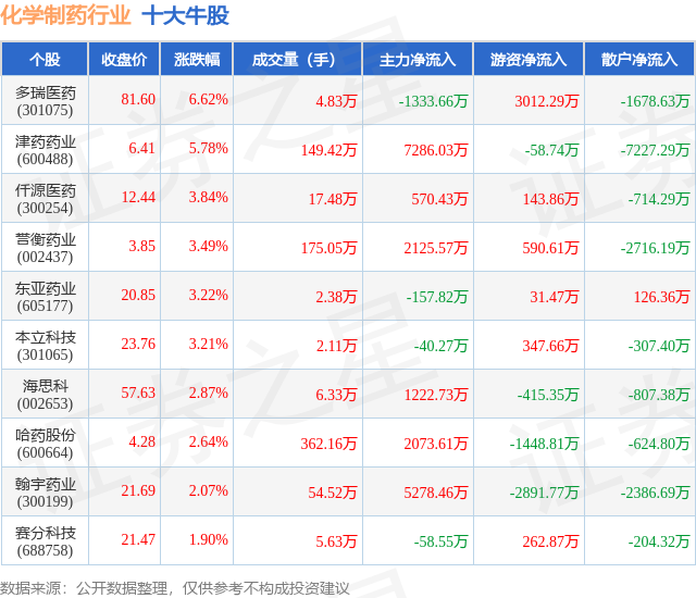 个股表现方面,化学制药行业当日领涨股为多瑞医药(301075),该股当日报收81.6,上涨6.62%,成交量4.83万,主力资金净流出1333.66万元。津药药业(600488)以上涨5.78%紧随其后,该股当日成交量149.42万,主力资金净流入7286.03万元。除此之外,仟源医药(300254)、誉衡药业(002437)、东亚药业(605177)均进入当日牛股之列。具体个股列表见下表: