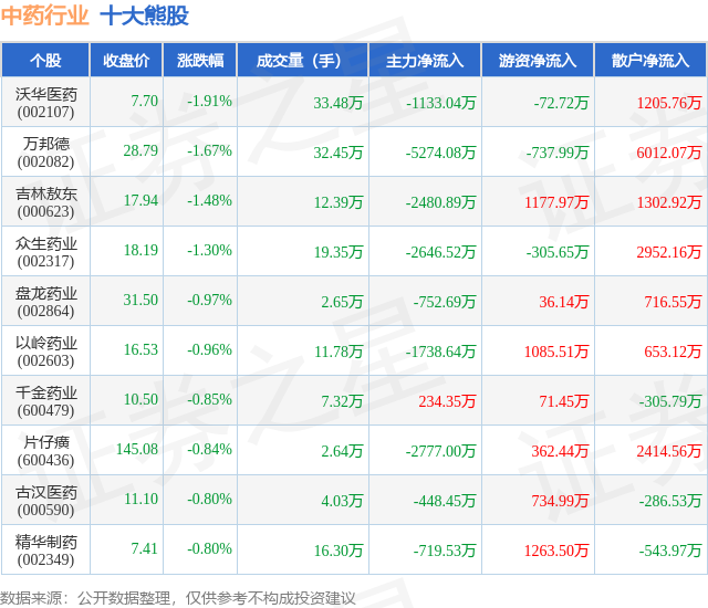 个股表现方面,中药行业当日领跌股为沃华医药(002107),该股当日报收7.7,下跌1.91%,成交量33.48万,主力资金净流出1133.04万元。万邦德(002082)以下跌1.67%紧随其后,该股当日成交量32.45万,主力资金净流出5274.08万元。除此之外,吉林敖东(000623)、众生药业(002317)、盘龙药业(002864)均进入当日熊股之列。具体个股列表见下表: