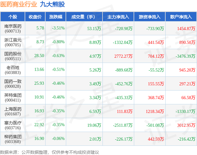 个股表现方面,医药商业行业当日领跌股为南京医药(600713),该股当日报收5.78,下跌3.51%,成交量53.15万,主力资金净流出720.98万元。浙江震元(000705)以下跌0.8%紧随其后,该股当日成交量8.89万,主力资金净流出1332.04万元。除此之外,国药股份(600511)、老百姓(603883)、国药一致(000028)均进入当日熊股之列。具体个股列表见下表: