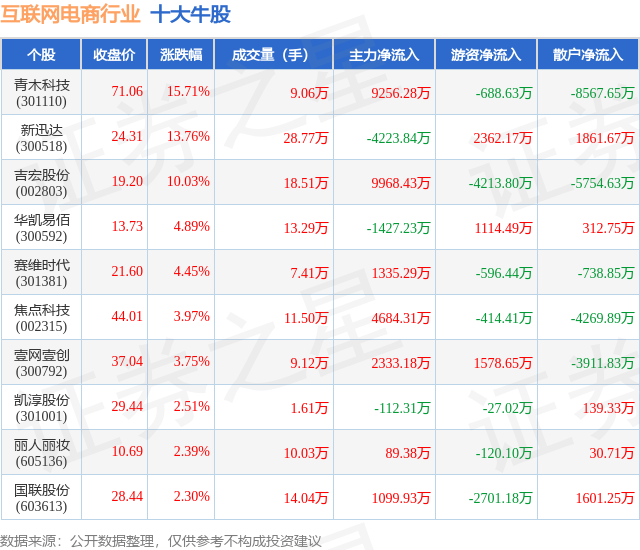 个股表现方面,互联网电商行业当日领涨股为青木科技(301110),该股当日报收71.06,上涨15.71%,成交量9.06万,主力资金净流入9256.28万元。新迅达(300518)以上涨13.76%紧随其后,该股当日成交量28.77万,主力资金净流出4223.84万元。除此之外,吉宏股份(002803)、华凯易佰(300592)、赛维时代(301381)均进入当日牛股之列。具体个股列表见下表: