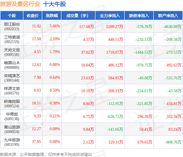 个股表现方面,旅游及景区行业当日领涨股为丽江股份(002033),该股当日报收11.02,上涨5.66%,成交量117.68万,主力资金净流入5209.27万元。三特索道(002159)以上涨2.1%紧随其后,该股当日成交量4.37万,主力资金净流入440.51万元。除此之外,天府文旅(000558)、峨眉山A(000888)、宋城演艺(300144)均进入当日牛股之列。具体个股列表见下表: