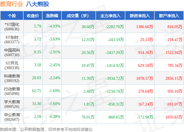 个股表现方面,教育行业当日领跌股为*ST国化(600636),该股当日报收5.79,下跌4.93%,成交量30.68万,主力资金净流出2202.7万元。ST东时(603377)以下跌3.63%紧随其后,该股当日成交量12.93万,主力资金净流出243.59万元。除此之外,中国高科(600730)、ST开元(300338)、科德教育(300192)均进入当日熊股之列。具体个股列表见下表: