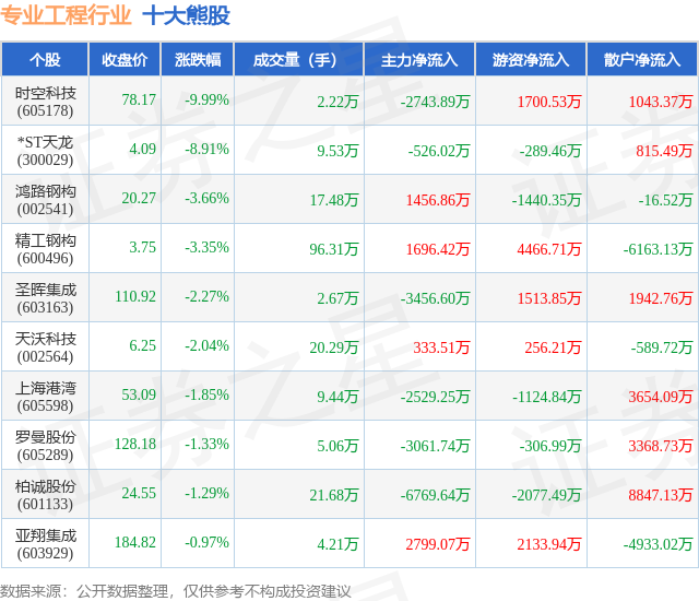 个股表现方面,专业工程行业当日领跌股为时空科技(605178),该股当日报收78.17,下跌9.99%,成交量2.22万,主力资金净流出2743.89万元。*ST天龙(300029)以下跌8.91%紧随其后,该股当日成交量9.53万,主力资金净流出526.02万元。除此之外,鸿路钢构(002541)、精工钢构(600496)、圣晖集成(603163)均进入当日熊股之列。具体个股列表见下表: