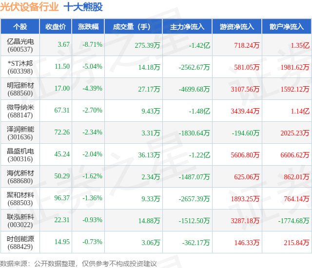 个股表现方面,光伏设备行业当日领跌股为亿晶光电(600537),该股当日报收3.67,下跌8.71%,成交量275.39万,主力资金净流出1.42亿元。*ST沐邦(603398)以下跌5.04%紧随其后,该股当日成交量14.18万,主力资金净流出2562.67万元。除此之外,明冠新材(688560)、微导纳米(688147)、泽润新能(301636)均进入当日熊股之列。具体个股列表见下表:
