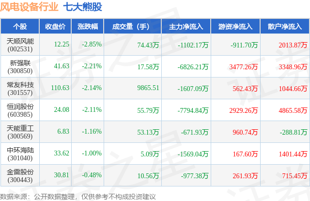 个股表现方面,风电设备行业当日领跌股为天顺风能(002531),该股当日报收12.25,下跌2.85%,成交量74.43万,主力资金净流出1102.17万元。新强联(300850)以下跌2.21%紧随其后,该股当日成交量17.58万,主力资金净流出6826.21万元。除此之外,常友科技(301557)、恒润股份(603985)、天能重工(300569)均进入当日熊股之列。具体个股列表见下表: