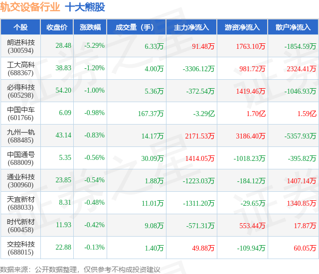 个股表现方面,轨交设备行业当日领跌股为朗进科技(300594),该股当日报收28.48,下跌5.29%,成交量6.33万,主力资金净流入91.48万元。工大高科(688367)以下跌1.2%紧随其后,该股当日成交量4.0万,主力资金净流出3306.12万元。除此之外,必得科技(605298)、中国中车(601766)、九州一轨(688485)均进入当日熊股之列。具体个股列表见下表: