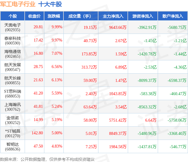 个股表现方面,军工电子行业当日领涨股为天奥电子(002935),该股当日报收20.81,上涨9.99%,成交量19.15万,主力资金净流入9643.66万元。泰豪科技(600590)以上涨9.97%紧随其后,该股当日成交量40.73万,主力资金净流入2.67亿元。除此之外,海格通信(002465)、航天发展(000547)、航天长峰(600855)均进入当日牛股之列。具体个股列表见下表: