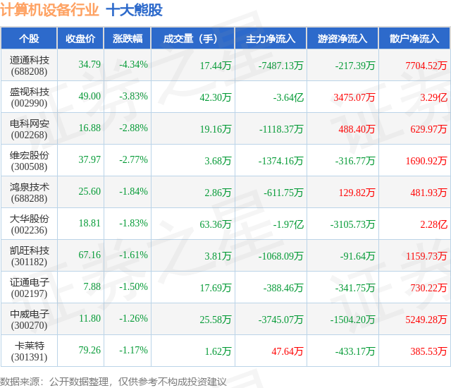个股表现方面,计算机设备行业当日领跌股为道通科技(688208),该股当日报收34.79,下跌4.34%,成交量17.44万,主力资金净流出7487.13万元。盛视科技(002990)以下跌3.83%紧随其后,该股当日成交量42.3万,主力资金净流出3.64亿元。除此之外,电科网安(002268)、维宏股份(300508)、鸿泉技术(688288)均进入当日熊股之列。具体个股列表见下表: