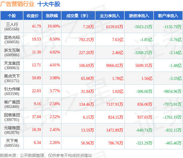 个股表现方面,广告营销行业当日领涨股为三人行(605168),该股当日报收41.79,上涨10.0%,成交量7.28万,主力资金净流入6159.03万元。蓝色光标(300058)以上涨8.5%紧随其后,该股当日成交量792.25万,主力资金净流入7.61亿元。除此之外,浙文互联(600986)、天龙集团(300063)、易点天下(301171)均进入当日牛股之列。具体个股列表见下表: