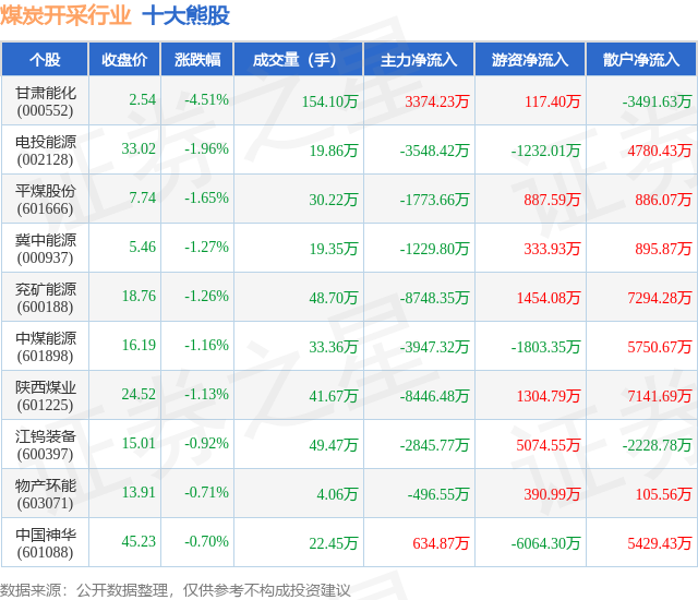 个股表现方面,煤炭开采行业当日领跌股为甘肃能化(000552),该股当日报收2.54,下跌4.51%,成交量154.1万,主力资金净流入3374.23万元。电投能源(002128)以下跌1.96%紧随其后,该股当日成交量19.86万,主力资金净流出3548.42万元。除此之外,平煤股份(601666)、冀中能源(000937)、兖矿能源(600188)均进入当日熊股之列。具体个股列表见下表: