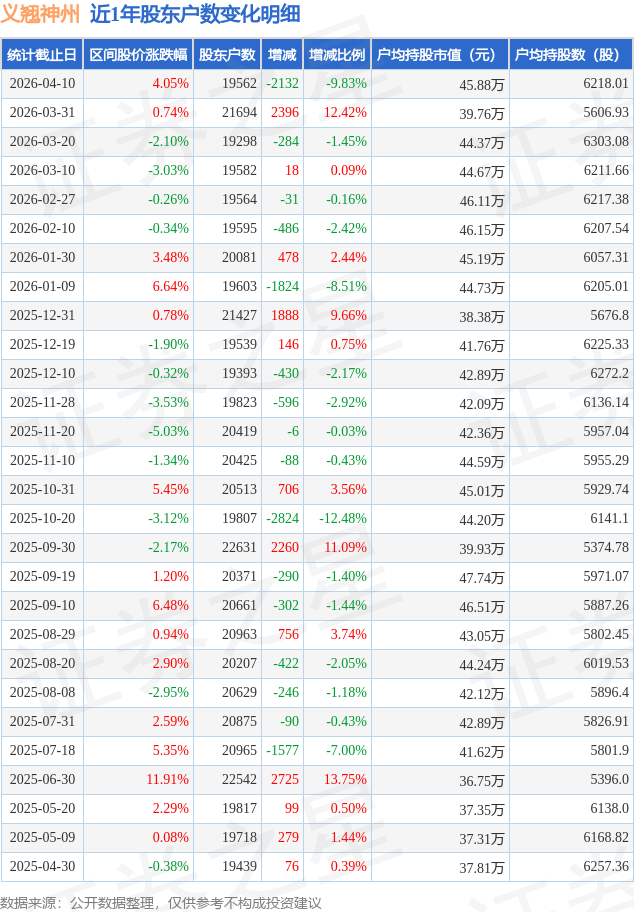 证券之星消息,近日义翘神州披露,截至2026年4月10日公司股东户数为1.96万户,较3月31日减少2132.0户,减幅为9.83%。户均持股数量由上期的5607.0股增加至6218.0股,户均持股市值为45.88万元。