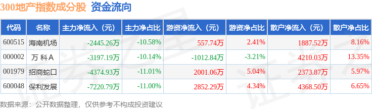 资金流向方面,300地产(000952)指数成份股当日主力资金净流出合计1.72亿元,游资资金净流入合计4398.24万元,散户资金净流入合计1.28亿元。成份股资金流向详情见下表: