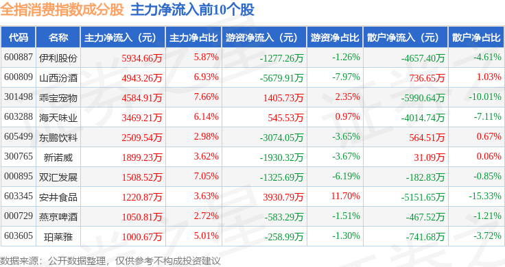 资金流向方面,全指消费(000990)指数成份股当日主力资金净流出合计5.32亿元,游资资金净流入合计1.48亿元,散户资金净流入合计3.84亿元。成份股资金流向详情见下表: