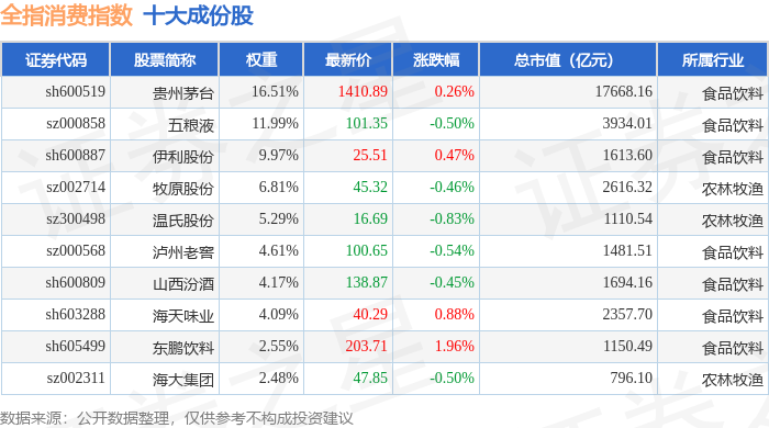 全指消费(000990)指数十大成份股详情如下: