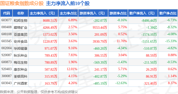 资金流向方面,国证粮食(399365)指数成份股当日主力资金净流出合计8.61亿元,游资资金净流入合计4.1亿元,散户资金净流入合计4.7亿元。成份股资金流向详情见下表: