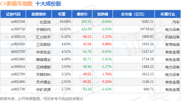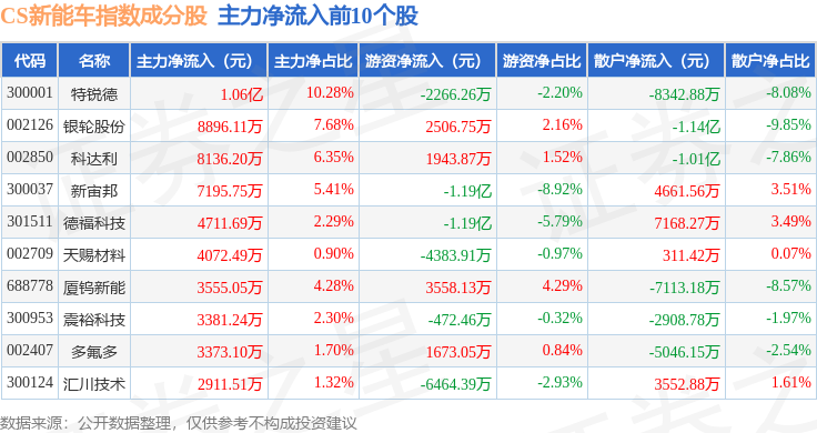 资金流向方面,CS新能车(399976)指数成份股当日主力资金净流出合计58.71亿元,游资资金净流入合计25.05亿元,散户资金净流入合计33.16亿元。成份股资金流向详情见下表: