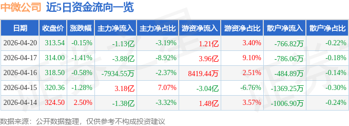 证券之星消息,截至2026年4月20日收盘,中微公司(688012)报收于313.54元,下跌0.15%,换手率1.81%,成交量11.35万手,成交额35.44亿元。