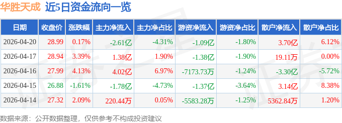 证券之星消息,截至2026年4月20日收盘,华胜天成(600410)报收于28.99元,上涨0.17%,换手率18.83%,成交量206.52万手,成交额60.42亿元。