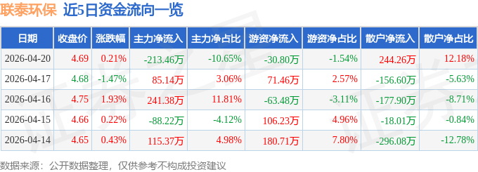 证券之星消息,截至2026年4月20日收盘,联泰环保(603797)报收于4.69元,上涨0.21%,换手率0.75%,成交量4.3万手,成交额2004.82万元。