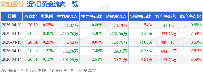 证券之星消息,截至2026年4月20日收盘,文灿股份(603348)报收于20.3元,上涨0.35%,换手率0.75%,成交量2.35万手,成交额4761.53万元。