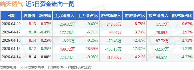 证券之星消息,截至2026年4月20日收盘,皖天然气(603689)报收于8.13元,上涨0.37%,换手率0.65%,成交量3.41万手,成交额2762.81万元。