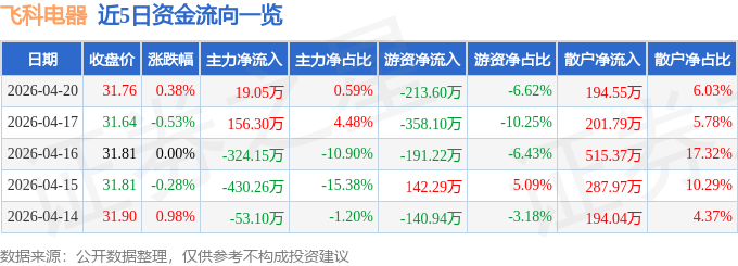 证券之星消息,截至2026年4月20日收盘,飞科电器(603868)报收于31.76元,上涨0.38%,换手率0.23%,成交量1.02万手,成交额3224.53万元。