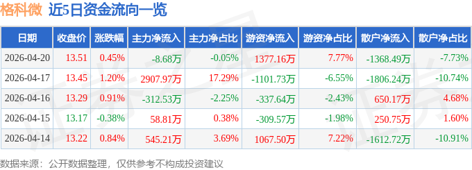 证券之星消息,截至2026年4月20日收盘,格科微(688728)报收于13.51元,上涨0.45%,换手率0.52%,成交量13.09万手,成交额1.77亿元。