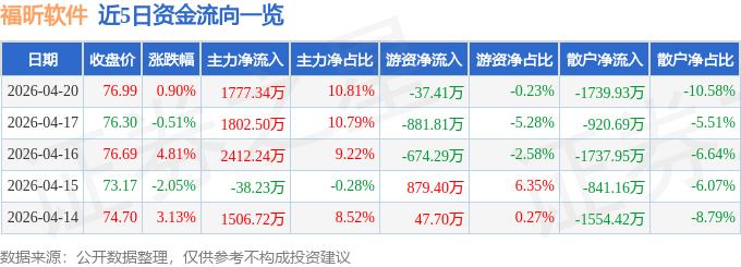 证券之星消息,截至2026年4月20日收盘,福昕软件(688095)报收于76.99元,上涨0.9%,换手率2.34%,成交量2.14万手,成交额1.64亿元。