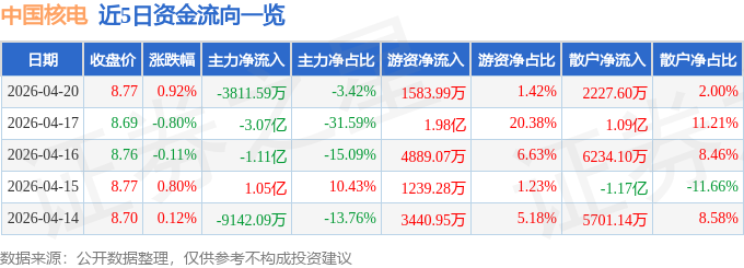 证券之星消息,截至2026年4月20日收盘,中国核电(601985)报收于8.77元,上涨0.92%,换手率0.67%,成交量127.2万手,成交额11.13亿元。