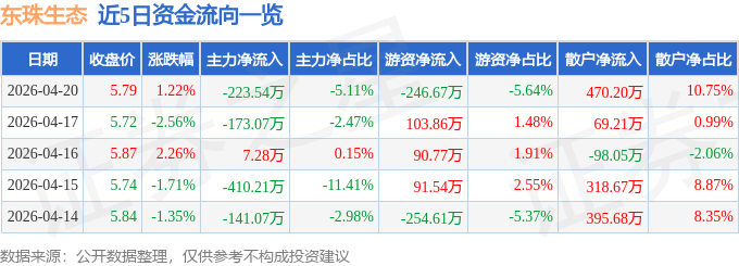证券之星消息,截至2026年4月20日收盘,东珠生态(603359)报收于5.79元,上涨1.22%,换手率1.7%,成交量7.58万手,成交额4374.33万元。