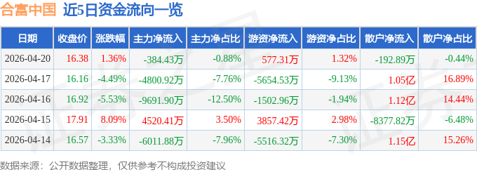 证券之星消息,截至2026年4月20日收盘,合富中国(603122)报收于16.38元,上涨1.36%,换手率6.74%,成交量26.83万手,成交额4.36亿元。