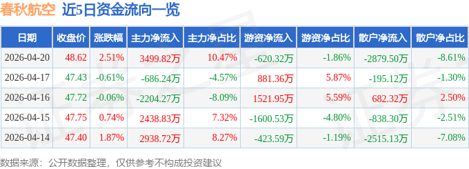 证券之星消息,截至2026年4月20日收盘,春秋航空(601021)报收于48.62元,上涨2.51%,换手率0.71%,成交量6.91万手,成交额3.34亿元。