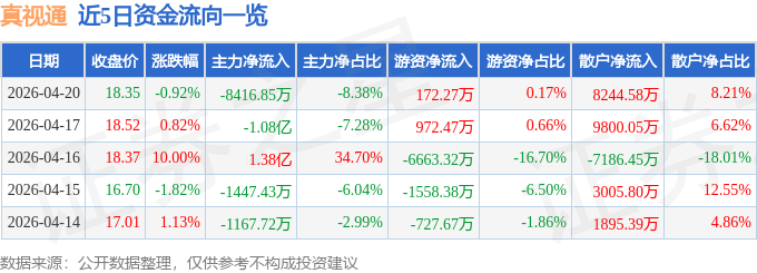 证券之星消息,截至2026年4月20日收盘,真视通(002771)报收于18.35元,下跌0.92%,换手率31.17%,成交量54.39万手,成交额10.04亿元。