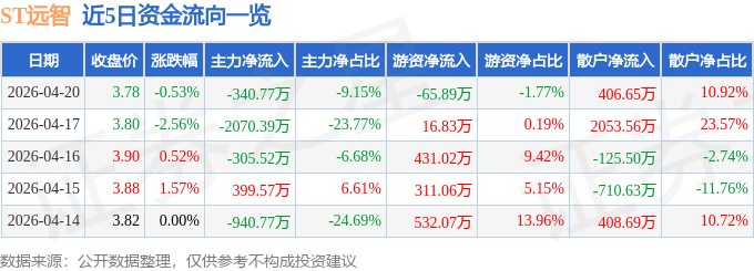 证券之星消息,截至2026年4月20日收盘,ST远智(002689)报收于3.78元,下跌0.53%,换手率0.94%,成交量9.82万手,成交额3724.62万元。